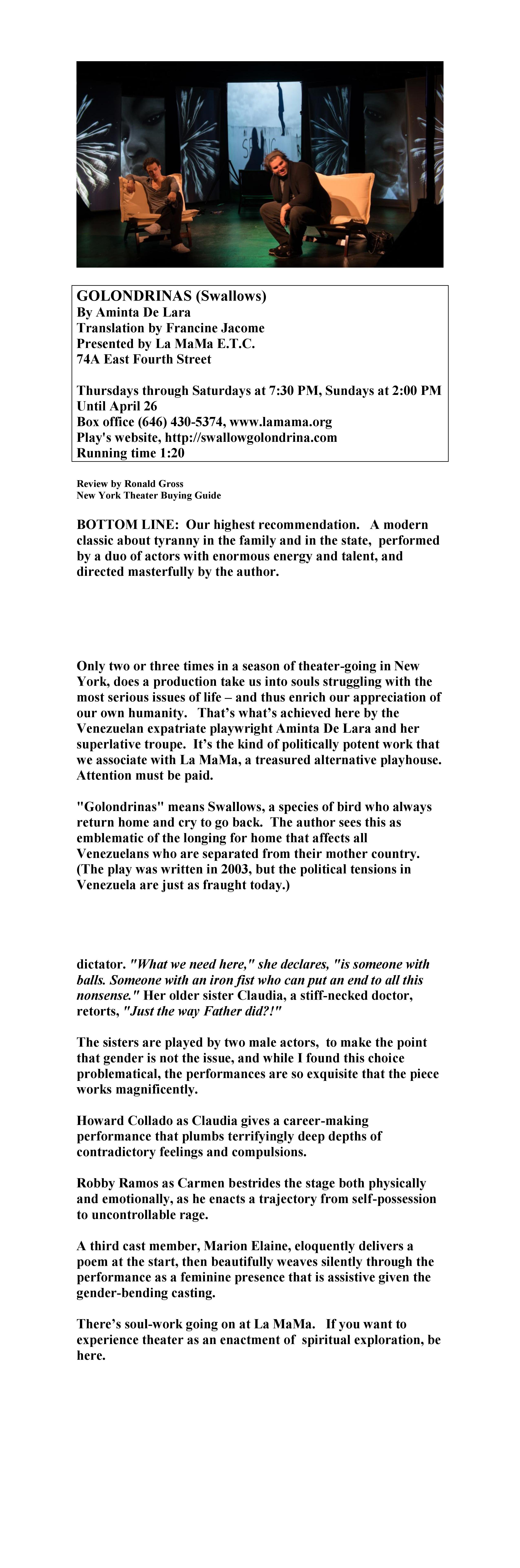 PRESS http://thefrontrowcenter.com/2015/04/golondrinasswallows/ http://blogcritics.org/theater-review-nyc-golondrinas-swallows-by-aminta-de-lara/ http://berkshireonstage.com/2015/04/14/grand-chilling-story-of-venezuela-families-and-politics-aminta-de-laras-golondrinas-swallows-at-la-mama/ Share this: Click to share on X (Opens in new window) X Click to share on Facebook (Opens in new window) Facebook Like Loading...